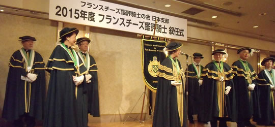 「フランスチーズ鑑評騎士の会」とはフランス語で(コンフレリ・デ・シュヴァリエ・(騎士団)デュ・タスト・フロマージュ・ド・フランス(フランスチーズ鑑賞、評価のこと))。1954年、フランスの伝統的チーズを護るために設立された団体です。本部はパリに置き、支部はフランス国内に23か所、ヨーロッパをはじめ世界に28カ国以上になっています。入会を認められた人には、シュヴァリエ(騎士)の称号を与える叙任式が行われます。中世の王様に身を捧げる契約の儀礼⇒剣を首に当てる“臣従礼”を模したものです。日本では、羽飾りの帽子、マントは中世の騎士のいでたちですが、物騒な剣を抜く代わりに、絹布で包んだバトンを叙任者の右肩に優しく当てるだけの、極めて象徴的なしぐさを採用しています。誓いの言葉「“オニ ソワキ サン フロマージュ プレタン ア ボンヌターブル ロンドルオマージュ”=食卓にチーズを供せずして、美食を装うなかれ」を合唱します。2015年の日本支部での累計叙任者は約400人です。入団者は、フランスチーズを生涯愛し、その普及啓発を誓った人々なのです。