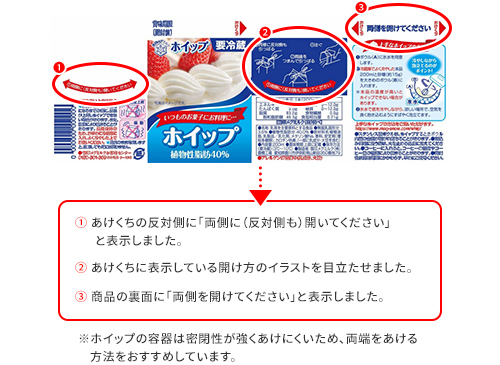 パッケージのあけ方を、「あけくち」付近と上部に目立つように表示しました。
