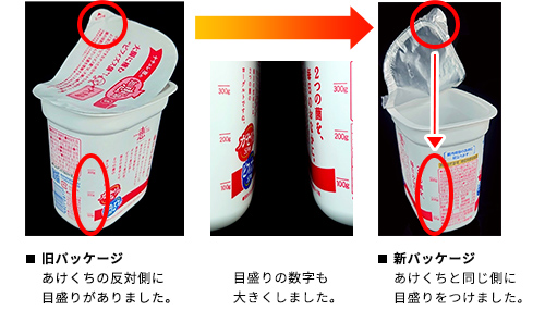 目盛りの位置を内ぶたのあけくち側に移動し、目盛りを目安にヨーグルトが測りやすくなりました。