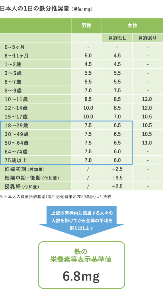 「栄養素等表示基準値」は「日本人の食事摂取基準」で示された栄養成分等の摂取量の基準を性別・年齢別毎の人口により加重平均した値です。 商品に表示されている「〇日分」とは、“日本人の〇日に必要な鉄量の表示を目的とした基準値”が書かれている、とお考えください。 本来、私たち一人ひとりに必要な鉄量は、年齢、性別、身体活動の程度、 月経の有無などによって異なりますので、日本人の1日の鉄推奨量をご参考にしてください。