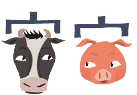 | 犠牲という漢字には、どちらにも牛へんがついていますね。古代中国の殷王朝時代(紀元前1600-1100年)では、農耕のための祭祀などで牛や羊、豚、犬などの動物を生贄(いけにえ)にする風習がありました。中でも牛は大地の生産力を高めると信じられ、特に生贄として重要視されていました。そんな背景から、犠牲の漢字に牛へんを使うようになったと考えられています。牛にとってはありがた迷惑です。 もうひとつ、牢(ろう)は、文字通り牛を屋根の下に囲うと書きます。大事な家族の財産である牛は、盗られたり逃げたりしないように、しっかり囲われていたんですね。牢屋、堅牢などと使われます。ちなみに古代中国では豚も大事な財産。家(いえ)という字は豚を屋根の下に囲うと書きます。豚もまた、家族同様に大切にされていたのですね。 |