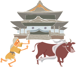 | | 昔、信濃国に強欲で意地悪な老婆が住んでいました。ある日、白い布を洗濯して干しておいたら牛が角で引っ掛けて逃げていってしまいました。驚いた老婆は怒って、牛のあとをどこまでも追いかけました。牛が逃げ込んでいった先は善光寺。おそるおそる金堂に入ってみると牛のよだれでかかれた文字が光っていました。読んでみると「牛とのみ 思いすごすな 仏の道に汝を導くおのれのこころを」とあります。「ただの牛のしたことだと思うなかれ、こうしてあなたの心を仏の道へと導いてくれたのです」といった意味でしょう。さすがに、老婆も心の奥に眠っていた仏心が目を開き、私欲を捨てて信仰の道に入ることができたということです。18世紀の「本朝俚諺(ほんちょうりげん)」に収められている逸話です。転じて、思いがけないことが縁で偶然よい方に導かれること(小学館ことわざ大辞典)、という意味に使われます。 |