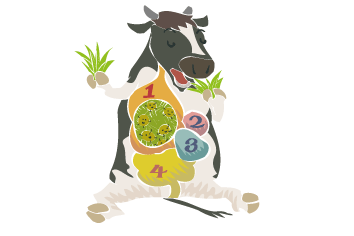 牛やヤギ、羊など反芻動物は四つの胃を持っています。第一の胃は、微生物の働きで、食べたものを発酵させます。今一度口に戻して、咀嚼(そしゃく)して、第二、第三、第四の胃に送って順次、消化し続けます。牛がいつも口をくちゃくちゃさせているのはこのためです。