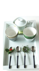 月に入ると、うちは玄関から始まって、リビング、キッチンと、クリスマス飾りが少しずつ増えていきます。庭の緑やキャンドル、食器、雑貨などを利用したコーナーごとのコーディネートは、やりすぎにならないように気をつけながら、今年はどんな風にしようかしらと考えるのが楽しみ。キッチンは棚に白い食器やワイングラスを集めて並べ変えるだけでもすがすがしい雰囲気になり、庭のローズマリーで作るリースは毎年の定番です。ティータイムにはクリスマス前から、写真のようなミニリースも登場します。ハーブの枝を丸めただけのリースや赤い実を添えたひいらぎの葉で充分。クリスマスのおもてなしでは、これをめいめいのカトラリーやお箸などに添えても、きっと喜んでもらえるはずです。
