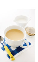 茶は昔からミルクティーが大好きです。人数が多いときは紅茶も必ずポットでいれていますが、家事の合間などに1人分だけいれたいときは簡単な方法で楽しんでいます。まず大きめのマグカップに好みのティーバッグ1個を入れ、熱湯を半分くらい注ぎます。そこに牛乳を八分めくらい入れ、ラップをかけて電子レンジ(600w)で1分ちょっと加熱。飲み頃に熱くなったらティーバッグを取り出していただきます。たっぷりのミルクを入れて飲むのが好きなので、いつも紅茶は濃いめに出しますが、種類はあまりこだわりません。ちょっと香りが飛んでしまったものでも、最後にしょうがのすりおろしやはちみつなどをプラスするとおいしくなります。