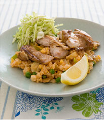 ひと皿の中に魚か肉、野菜、ごはんかパンを合わせますが、