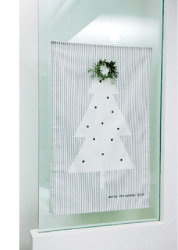 毎年うちでは今頃から、お客様を迎える玄関や洗面台のコーナー、リビングやキッチンの棚、壁などに少しずつクリスマス飾りが増えていき、クリスマス本番の頃には、うちじゅうがクリスマスになっています。ツリー、大小のリースやオーナメント、キャンドルなどが中心になりますが、クリスマス柄のキッチンクロスは、場所をとらずに気楽に飾れて便利です。写真のものは、グレーのストライプ地に白いツリー、中にグリーンのドットがプリントされた私のオリジナル。壁面にタペストリーのように飾って手前においたテーブルにキャンドルを並べたり、ツリーのてっぺんにハーブで作ったミニリースをつけてナチュラルな雰囲気を楽しんだり。家の中のなにげないコーナーでこんな飾りに出合うと、クリスマスが近いことを思い出して温かい気持ちになります。