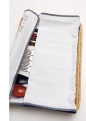 うちのおもてなしで多いのは、カウンターテーブルに大皿料理を並べるビュッフェスタイルです。各自は取り皿とカトラリーを手に、テーブルを回って料理を取り分けます。メニューに汁気のものがあるときは、大皿のほかに小皿やごはん茶碗くらいのボウルなどを用意し、入れ子にして使ってもらいます。お箸、ナイフ、フォーク、スプーンなどのカトラリーは取りやすく並べ、取り皿のそばに。カトラリーをちょっとおしゃれに見せたいときは、トレーにキッチンクロスを敷いてセット。クロスのサイズが大きければ中に織り込んで調節します。写真のキッチンクロスは、オフホワイトのリネンにストライプのパイピングがアクセントになった私のオリジナル。この場所がスタートで、好きなものから順に取り分け、お替りしながらみんなに楽しい時間を過ごしてもらうのが、私のとてもうれしいことです。
