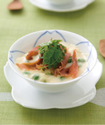 そろそろ出回り始める新たけのことグリーンピースにエビを合わせ、