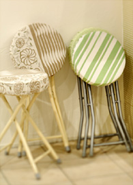 椅子は大好きで、家のあちこちにタイプの違う椅子を並べています。その中でもいちばん気軽なタイプといえば、この折りたたみ式のパイプ椅子でしょうか。キッチンで仕事中にちょっと腰かけたり、スタッフと打ち合わせをするときも、好きな場所でさっと広げられます。お昼どき、急に人が増えたときでも、気軽なこの椅子が重宝します。使わないときは折りたたんで、いつもはカウンターテーブルの下が収納場所。この椅子の座面に、あるときカバーをしてみました。余り生地やキッチンクロスなどを利用し、周囲にゴムを通しただけの簡単なものです。でもキッチンに合わせて好きな色柄で揃えられますし、汚れたらすぐ洗濯できるので便利。手頃な折りたたみ椅子ですが、毎日使っていると愛着が沸いてくるものです。