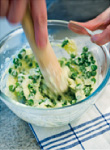 水気を拭いたグリーンピースを加え、マッシュポテトの中で粗くつぶす(写真b)。 |