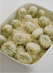 (6)を小さな楕円形や洋なし形にまとめ、薄力粉、溶き卵、パン粉の順に衣をつける(写真c)。 |