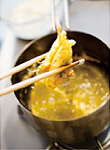ボウルにAの天ぷら粉と冷たい牛乳のそれぞれ半量を入れ、軽く混ぜる。スナップえんどうを入れて衣をからめ、熱した油でカリッと揚げる。残りのAで同様に衣を作り、刻んだ木の芽を入れて混ぜ(写真a)、たけのこをからめ、熱した油でカリッと揚げる(写真b)。 |