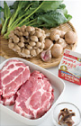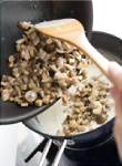 フライパンにオリーブ油大さじ2を熱し、しめじ、マッシュルームを炒め、(2)が煮立ったところに加え(写真b)、火を強め、塩、こしょうで味を調え、水溶きのコーンスターチでとろみをつける。 |