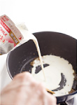 鍋にオリーブ油大さじ1を熱し、にんにくを炒めて香りが出たらアンチョビを加えて炒め、生クリームを入れ(写真a)、ふきこぼれないように温める。 |