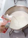 鍋に牛乳を入れ、沸騰直前まで温めて火を止め、三温糖を加えて溶かし、生クリームを入れる(写真a)。 |