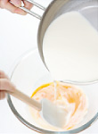 ボウルに卵黄を入れ、(2)を加えてよく混ぜ(写真b) 、シナモン、しょうが汁を加える。 |