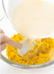 (1)のかぼちゃに(3)の卵液を少しずつ加え混ぜる(写真c)。 |