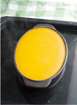 耐熱容器の底面に三温糖を敷き詰め、(4)のプリン生地を静かに流し入れ、天板にのせて湯を張る(写真d)。 |