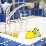 いタイルのカウンターテーブルにとりつけた白い小さな2槽式のシンク。メインのシンクとは別に、私がこだわったキッチンのコーナーです。朝、庭でつんだ花をここで生けたり、ちょっとした洗いものをしたり。シンクはコンロと並べるとどうしても汚れやすいですが、思いきって離すことで、水まわりがちょっと楽しい作業コーナーになっています。2槽の小さいほうは栓をして氷水を張ると、飲み物やくだものを冷やすのに便利です。人が来たときはお酒を冷やし、このカウンターまわりで食前酒を楽しんだりもしています。それだけに目につくコーナーなので、水はねはまめに拭き、使い終わったあとはきれいに洗って乾いた布で拭き取っています。蛇口もこうすると気持ちいいくらいいつもぴかぴかです。