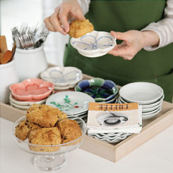 食器棚を整理しながらふと、コンパクトに用途別の器を集めておいたら便利だと思いました。早速、手持ちの器やカトラリーを選び、手軽に持ち運べるよう、トレーの上にのせて、お茶の時間に便利なトレーの完成です。たとえばチーズケーキやスコーン、ドーナッツなどのおやつを、皿から取り分けてのせるのにうちでよく使うのが直径12cm前後の皿なので、和洋取り混ぜて何種類か重ねておきます。カトラリーはカラフルな持ち手がかわいいステンレスのスプーン、フォークを始め、木のバターナイフやスプーンも混ぜ、取りやすいように立ち上がりのある容器に入れておきます。ペーパーナプキンは小さいサイズのものを添えておきます。同じように豆皿ばかり集めて酒のつまみ用のトレー。直径21~24cmくらいの皿、ソース入れ、大きめのカトラリーを集めて料理用のトレーができました。テーブルにトレーごと持ち出せば、気楽にお茶の時間やビュッフェスタイルのごはんが始まります。