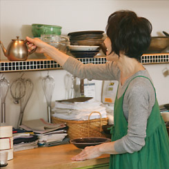 わが家のオープンキッチンはリビングに続く一角にあり、その顔ともいえるのが壁一面の広い収納棚です。うちに来た人たちは玄関やリビングのインテリア同様、印象に残る場所だといってくれます。私も毎日ここで料理を作るので、使い勝手がよいことはもちろんですが、ほっとなごめる場所にもしたいなと思っています。時間があるといつも掃除と片づけを兼ねて模様替えが始まり、止まらなくなるほど。好きな作家さんたちの器、旅先で見つけたもの、家族やまわりからのプレゼントなど、身近に置いて使いたいものが並びます。器はそのときどき、私の中で白磁と黒い器に夢中のときもあれば、濃紺や染付、色絵、焼き締め、漆器などひかれるものがあるので、手持ちの中から集めてきます。ここに並んだ器は和洋にこだわらず、うちのごはんをのせて毎日楽しんでいます。