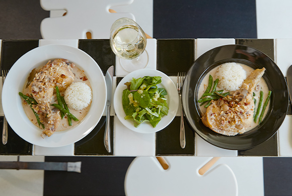 牛乳に鶏もも肉のおいしさが溶け込んだ、こくのある煮込み料理。ナッツの食感がアクセントに。