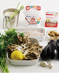 | 2 | なすとまいたけのマリネを作る。にんにくはつぶす。まいたけは厚みを半分に切るように4等分する。なすはヘタを切り落とし、縦4枚に切る。 |