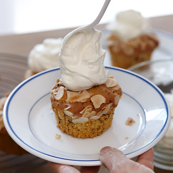• 9. 焼き上がったら型から出して冷まし、紙ケースをはがす。(8)のホイップクリームをたっぷりと添えていただく。