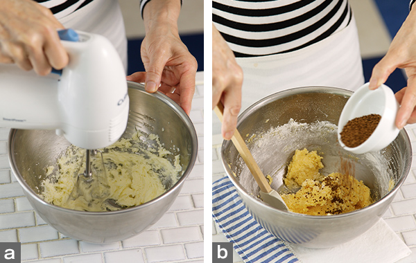 • 3. 薄力粉とベーキングパウダーを合わせてふるい入れる。顆粒インスタントコーヒーはそのまま加え(b)、ラム酒をからめたレーズンも加えてさっくりと混ぜる。