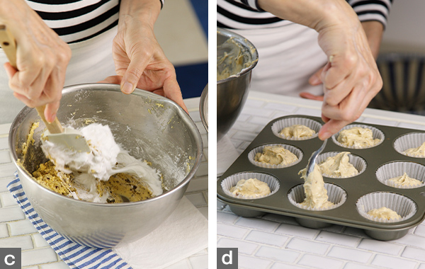 • 6. 型に(5)の生地を等分に流し入れ(d)、表面をならす。型を持ち上げて2~3度軽く落として余分な空気を抜く。