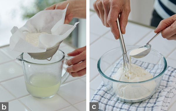 - 7. 容器などにざるを重ねてペーパータオルを敷き、プレーンヨーグルトを入れてラップをし、冷蔵庫で3時間以上水切りする(写真b)。