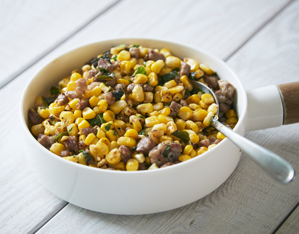 - 3. フライパンにオリーブ油大さじ1を熱し、豚肉を入れて焼きつけるよう強火で炒め、軽く塩、こしょうをふる。残りの油を足し、とうもろこしを加えてさらによく炒め、塩、こしょうで味を調え、火を止める。