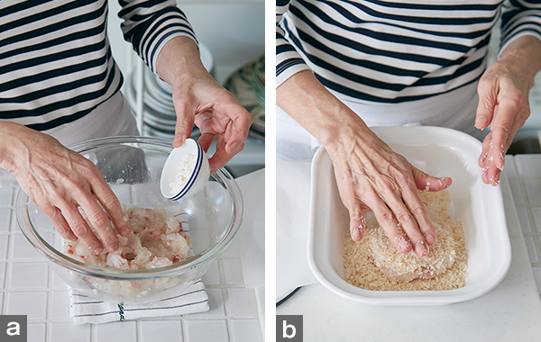 - 3. 少し水で濡らしたターナーで②の生地をすくい、パン粉の上に返してのせ、両面にまぶす(写真b)。