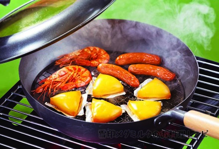 1)のフライパンに網をのせ、強火にかける。煙が出てきたら、ウインナーソーセージ、えびをのせる。チーズはアルミ箔の上にのせる。ふたをして中弱火で10分~15分ほど燻す。