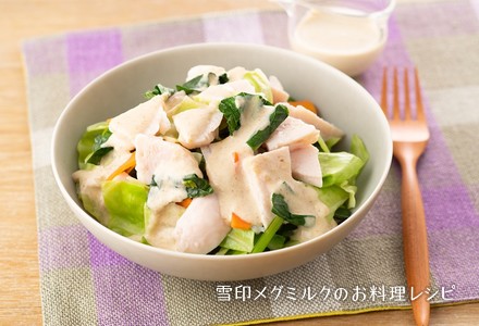 カルシウムアップも意識し、野菜には小松菜を、ドレッシングにもカルシウムが摂れるヨーグルトとすりごまを使います。ヨーグルトのドレッシング!?意外でしょうが、香ばしくてさっぱりといただけますよ。ヨーグルトを食べる感覚でたっぷりかけてお召し上がりくださいね。 -