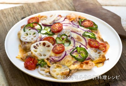 鶏もも肉を開いて生地にしたユニークピザです。こんがりと焼けるチーズをのせ、野菜もたっぷりとトッピング。れんこんのシャキッとした食感が良く合います。オーブンの代わりにフライパン調理でもOK。その場合は皮目ではなく肉の面を下にして中火で3〜4分焼き、上下を返してチーズと具をのせ、蓋をして5〜6分蒸し焼きに。