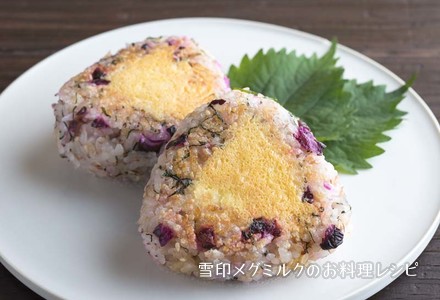 三角のおにぎりの中に「6Pチーズ」をぎゅっと押し込んだダブル三角の焼きおにぎりです。鰹の香りやしば漬けの歯ざわり、チーズのまろやかなコク。いろいろなおいしさが広がります。香ばしい焼き色がつくよう、チーズは隠れないように握るのがコツ。ラップを使って握ると形を整えやすいですよ。