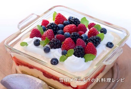 深めの器にスポンジ生地とクリームを重ねて作る簡単ケーキ。ガラスの器を使うと断面が見えて見た目もきれいです。フルーツは季節に合わせお好みで。大きめのスプーンでスコップのようにすくって取り分けましょう。みんなで気軽に楽しめ、盛りあがること間違いなし。