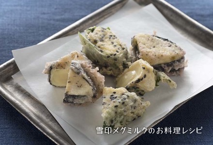 カマンベールチーズの天ぷらです。揚げる際に、チーズが流れでないようチーズの切り口を海苔としその葉でしっかり覆いましょう。さっと揚げて、熱々を食べると