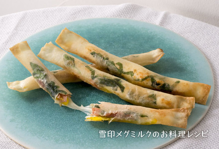 おつまみにもおやつにもおすすめの一品。「さけるチーズ」とパプリカを春巻きの皮で巻き、香ばしく揚げました。パリッとした食感とチーズのコク、ジューシーなパプリカの風味が楽しめ、バジルも味のアクセントに。水気があると春巻きの皮が破れやすいので、パプリカは水気をよくとっておきましょう。油で揚げずにトースター調理でも手軽です。焦げやすいので様子を見ながら焼きましょう。
