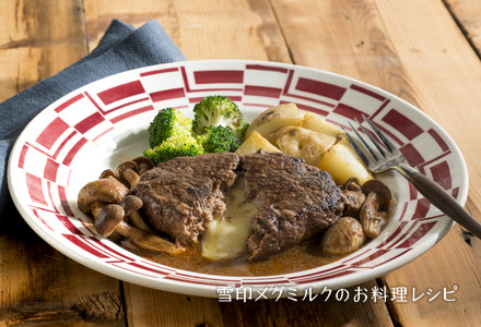 中ダネに「とろけるスライス」を包み込んだ煮込み仕立てのハンバーグです。カットすると中からチーズがとろ〜り。まさに、チーズハンバーグの王道ですね。きのこと一緒にじっくり煮込んだら、じゃがいもとブロッコリーを添えて出来上がり。チーズを生地に包みにくい時は、1個分の肉ダネを半分に分け、サンドイッチのようにチーズを挟むようにして包むとうまくできますよ。
